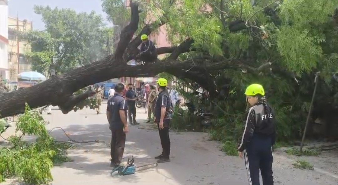 भरभरा कर गिरा नीम का विशाल पेड़, दो अस्थाई दुकानें दबी, एक स्कूटी क्षतिग्रस्त हुई