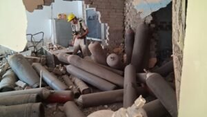 मुजफ्फरनगर (रिपोर्टर)। नगर के प्रकाश चौक के पास गैस रिफिलिंग की दुकान में आॅक्सीजन सिलिंडर फटने से बड़ा धमाका हो गया। हादसे में 5 दुकानें क्षतिग्रस्त हो गईं और 4 लोग घायल हो गए। पुलिस उक्त मामले की जांच में जुटी है। धमाके के बाद मुख्य मार्ग व आसपास की दुकानों में अफरा-तफरी मच गई। तेज आवाज सुनकर लोग मौके पर पहुंचे और घायलों को तुरंत अस्पताल पहुंचाया गया।