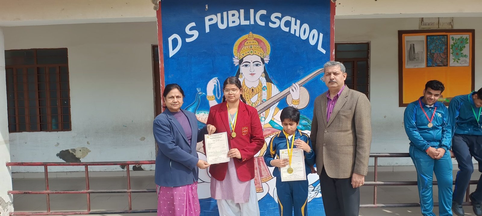 मुजफ्फरनगर। आज यहां डी एस पब्लिक स्कूल में विभिन्न प्रतियोगिताओं में श्रेष्ठ प्रदर्शन कर पुरस्कार एवं पदक जीतने वाले विद्यालय के मेधावी विद्यार्थियों को मेडल्स पहनाकर सम्मानित किया गया। स्कूल एजुकेशन डायरेक्टर श्रीमती संतोष जैन तथा प्रधानाचार्य श्री गगन शर्मा सहित संबंधित शिक्षक शिक्षिकाओं ने विद्यार्थियों को सम्मानित करते हुए सर्टिफिकेट देकर एवं मैडल पहनाकर पुरस्कृत किया। विद्यालय में आज जिला एवं मंडल स्तर पर प्रमुख समाजसेवी संस्था भारत विकास परिषद द्वारा प्रतिवर्ष आयोजित होने वाली , भारत को जानो प्रतियोगिता में जूनियर एवं सीनियर ग्रुप में श्रेष्ठ प्रदर्शन कर मेडल्स जीतने वाले विद्यार्थियों को सम्मानित किया गया। जूनियर ग्रुप में कक्षा 6 से सत्यम, कक्षा 8 से भानु प्रताप शर्मा एवं कक्षा 8 से ही अक्षत ने शानदार प्रदर्शन करते हुए अपने-अपने ग्रुप में पदक प्राप्त किये। सीनियर ग्रुप में कक्षा 9 से पूर्वी, कक्षा 10 से अभिनव तथा कक्षा 11 से तन्मय भगत ने इस प्रतियोगिता में शानदार प्रदर्शन करते हुए विद्यालय के लिए पदक प्राप्त किये। विद्यालय के मंच पर आज प्रमुख संस्थान शांतिकुंज हरिद्वार द्वारा विशाल स्तर पर आयोजित होने वाली एक और प्रमुख प्रतियोगिता भारतीय संस्कृति ज्ञान परीक्षा में श्रेष्ठ प्रदर्शन करने वाले विद्यार्थियों को भी सम्मानित किया गया । भारतीय संस्कृति ज्ञान परीक्षा में विद्यालय से जूनियर ग्रुप में कक्षा 6 से ऋषभ जैन तथा सीनियर ग्रुप में कक्षा 11 से सानवी शर्मा ने अपने-अपने ग्रुप में शानदार प्रदर्शन करते हुए प्रथम स्थान प्राप्त करके मेडल प्राप्त किया। सभी विद्यार्थियों को परीक्षाओं का आयोजन करने वाली संस्था की ओर से प्रशस्ति पत्र देकर भी सम्मानित किया गया। विद्यालय के मंच पर आज मेरठ में आयोजित हुई जूडो नॉर्थ जोन प्रतियोगिता में प्रथम स्थान प्राप्त कर , स्वर्ण पदक जीतने वाली तथा राज्य स्तर के लिए क्वालीफाई करने वाली विद्यालय की होनहार छात्रा वंशिका पंवार को भी उनकी उपलब्धि पर मेडल पहनाकर सम्मानित किया गया। वंशिका नेशनल ग्रेपलिंग के लिए भी क्वालीफाई कर चुकी है। स्कूल एजुकेशन डायरेक्टर श्रीमती संतोष जैन तथा विद्यालय प्रधानाचार्य श्री गगन शर्मा ने सभी बच्चों को उनकी सफलता पर बधाई देते हुए उनके उज्जवल भविष्य की कामना की। बच्चों को बधाई देते हुए तथा प्रेरित करते हुए उन्होंने कहा कि उचित मार्गदर्शन के साथ सही दिशा में निरंतर परिश्रम करके निश्चय ही लक्ष्य में सफलता मिलती है। स्कूल प्रधानाचार्य श्री गगन शर्मा ने कहा कि विद्यालय के लिए यह बहुत ही खुशी एवं गौरव की बात है कि विद्यालय के विद्यार्थी जनपद में आयोजित होने वाली हर प्रमुख परीक्षा में भाग 