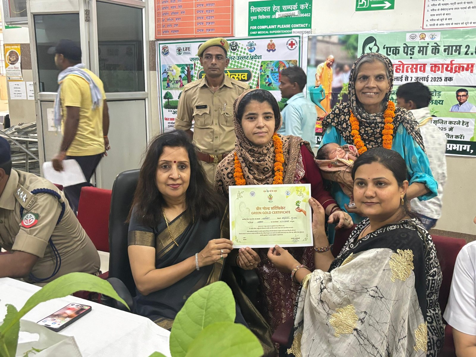 चेयरपर्सन मीनाक्षी स्वरूप ने कहा कि जुलाई माह में प्रदेश में आयोजित हो रहे वन महोत्सव के अंतर्गत यह अभियान हीटवेव से ग्रीनवेव की दिशा में सार्थक प्रयास है। उन्होंने बताया कि इस अभियान के तहत 1 से 8 जुलाई तक जन्म लेने वाले नवजात को ग्रीन गोल्ड सर्टिफिकेट दिया जा रहा है और इन बच्चों की माताओं को एक पौधा भेंट किया जा रहा है, ताकि नवजात बच्चों की तरह पौधों की देखभाल की जा सके। उन्होंने कहा कि मुख्यमंत्री योगी आदित्यनाथ की इस पहल को भावनात्मक रूप से जोड़ने के लिए नवजात शिशुओं व माताओं को इससे जोड़ा गया है। इस बार प्रदेश में कुल 35 करोड़ पौधे रोपने का लक्ष्य निर्धारित किया है। वर्ष 2017 से 2024 के बीच यूपी में 204.92 करोड़ से अधिक पौधे लगाए जा चुके हैं और हरित आवरण में 3 लाख एकड़ की ऐतिहासिक उपलब्धि दर्ज की गई है। कार्यक्रम में अतिथियों व जिला अस्पताल कर्मचारियों द्वारा पौधारोपण कर पर्यावरण संरक्षण का संकल्प लिया गया। कार्यक्रम संचालन डॉ. राजीव कुमार ने किया। इस दौरान मुख्य चिकित्सा अधीक्षक डॉ. आभा आत्रे, क्षेत्रीय वन अधिकारी आदित्य सोनकर, डीएचओ डॉ. रचना सिंह एवं वन दरोगा दीपांजलि समेत संबंधित अधिकारी-कर्मचारी मौजूद रहे।