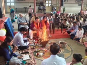कार्यक्रम का शुभारंभ विद्यालय प्रबंधक बाल बहादुर, उपप्रबंधक ज्ञानचंद संगल, विद्या भारती के प्रतिनिधि एवं भागवंती सरस्वती विद्या मंदिर के संस्थापक सदस्य गंगा प्रसाद एवं प्रधानाचार्य डॉ अखिलेश कुमार शर्मा ने संयुक्त रूप से मां शारदे के सम्मुख दीप प्रज्ज्वलन के साथ किया। नए शैक्षणिक सत्र के शुभारंभ के अवसर पर विद्यालय के हिंदी प्रवक्ता विवेक शर्मा, विकास शर्मा एवं संगीत शिक्षिका अनन्या त्रिपाठी ने हवन कार्य संपन्न कराया। विद्यालय के प्रबंधक बाल बहादुर सप्तनीक मुख्य यजमान की भूमिका में रहे। सभी बच्चों ने सामूहिक रूप से गायत्री मंत्र का जप किया। हवन में समस्त छात्र-छात्राओं एवं शिक्षकगणों ने आहुति दी। विद्यालय प्रधानाचार्य डॉ अखिलेश कुमार शर्मा ने चरण स्पर्श के साथ विधिवत कन्या पूजन किया।